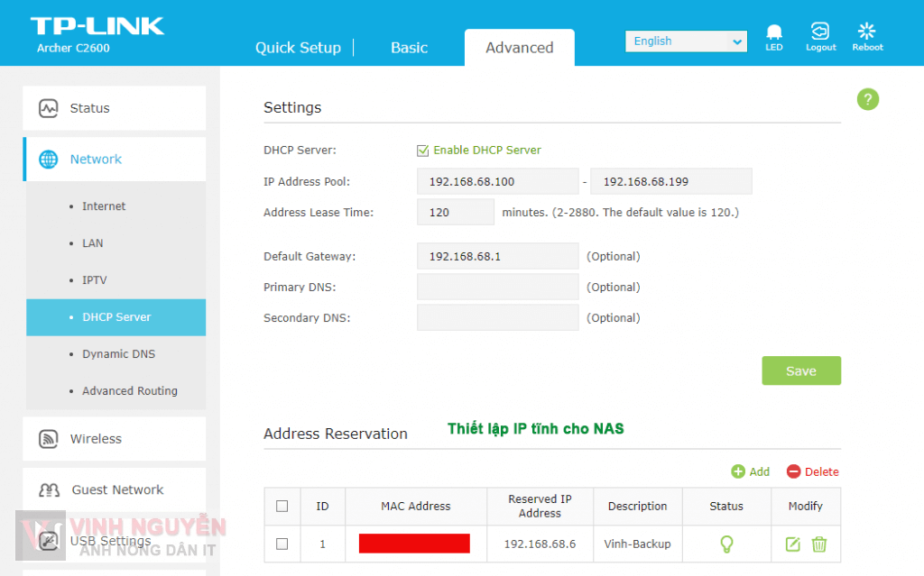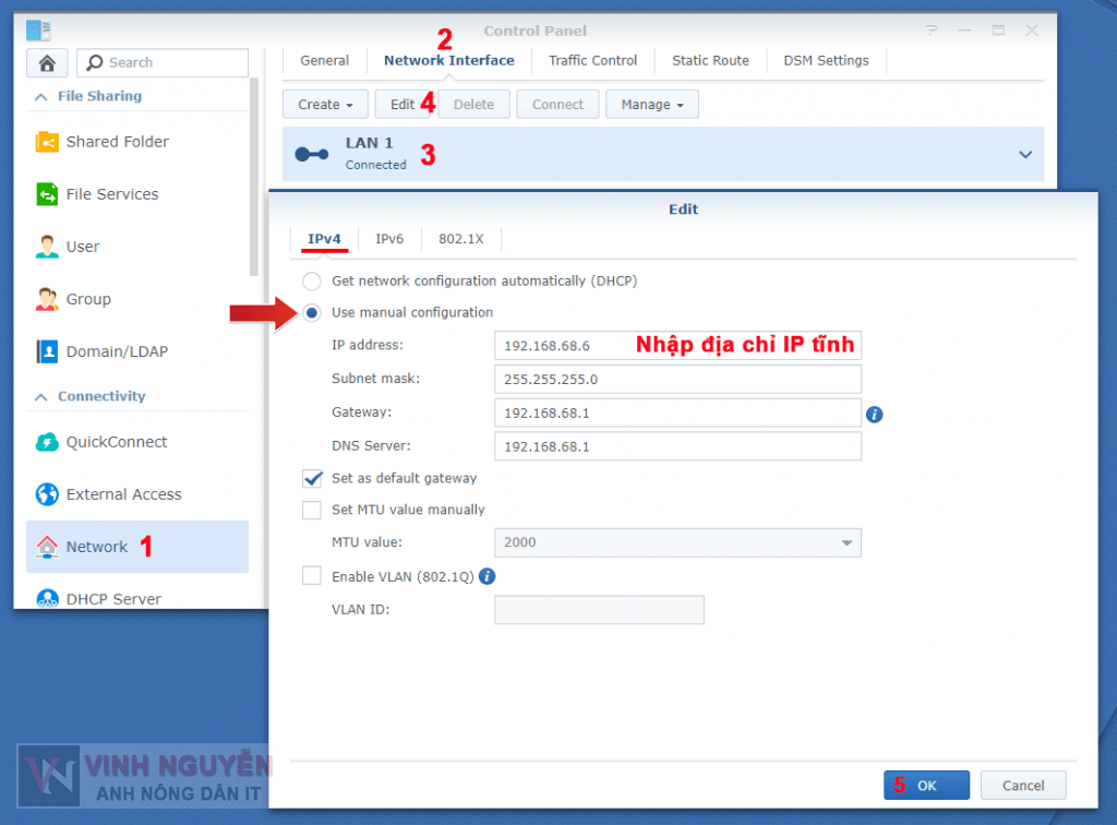 Việc thiết lập IP tĩnh cũng rất quan trọng, việc này giúp bạn truy cập vào NAS ổn định, dễ cấu hình chia sẻ, ứng dụng… IP tĩnh bạn chọn nên dễ nhớ 😛 . Có 2 cách để làm.