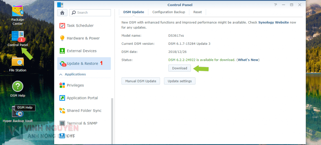 Sau khi cài đặt xong DSM việc cập nhật lên phiên bản mới nhất là rất cần thiết. Bạn có thể vào Control Panel để kiểm. Cập nhật ứng dụng thì bạn vào Package Center để kiểm tra. Xem hướng dẫn tại đây.