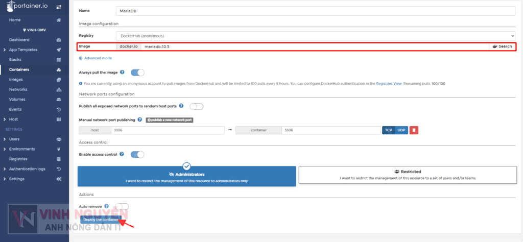 - Name: Tên của container, mình đặt luôn là MariaDB cho dễ nhớ.