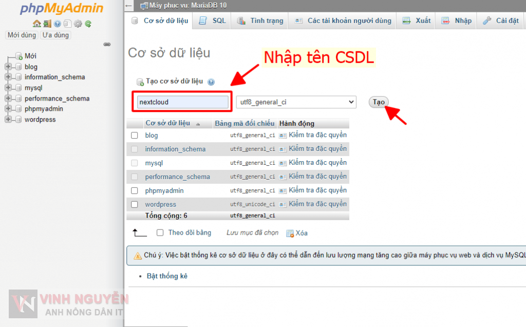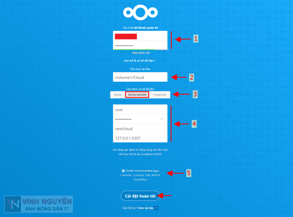 - Tên cơ sở dữ liệu: nextcloud (tạo ở bước 2)