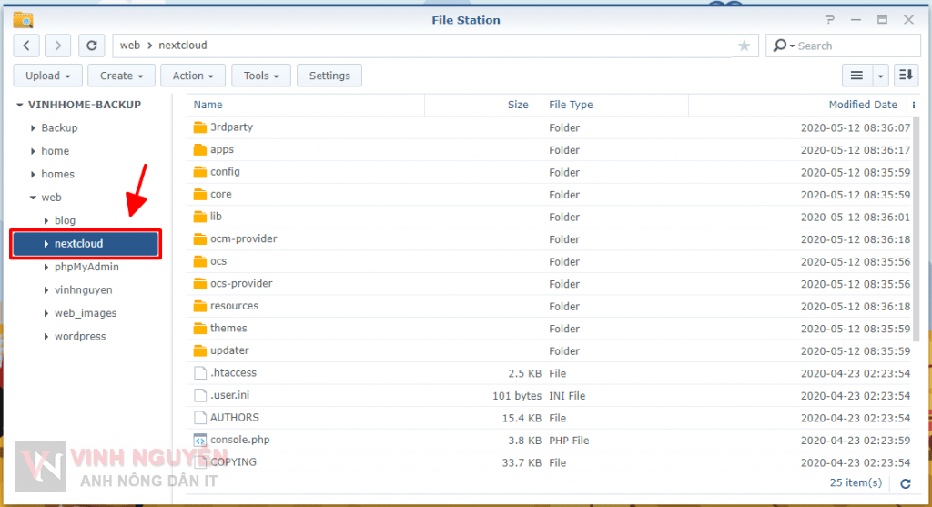 - /volume1/web/nextcloud/ tương ứng với thư mục lưu trữ mã nguồn NextCloud.