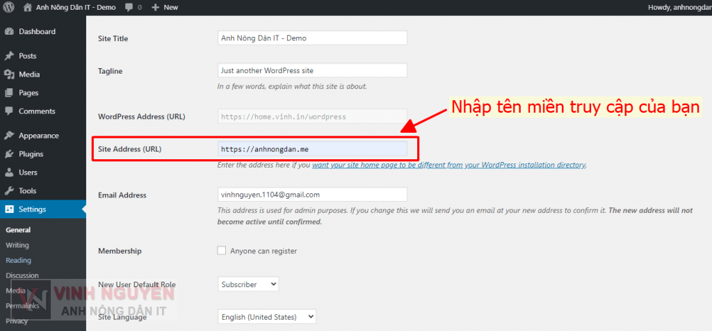 Bước 4: Thay đổi lại địa chỉ truy cập trong WordPress Settings.