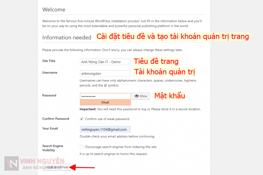Như vậy là chúng ta đã cài xong WordPress, nhanh chóng và dễ dàng chỉ trong vòng có 5 phút. Nếu bạn nào để chạy offline hoặc chạy dạng http://<IP hoặc Domain>/wordpress đến đây là xong. Trong trường hợp bạn có domain, sub domain và muốn trang WordPress truy cập bằng domain, sub domain thì đến với bước 3.