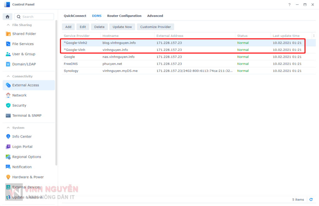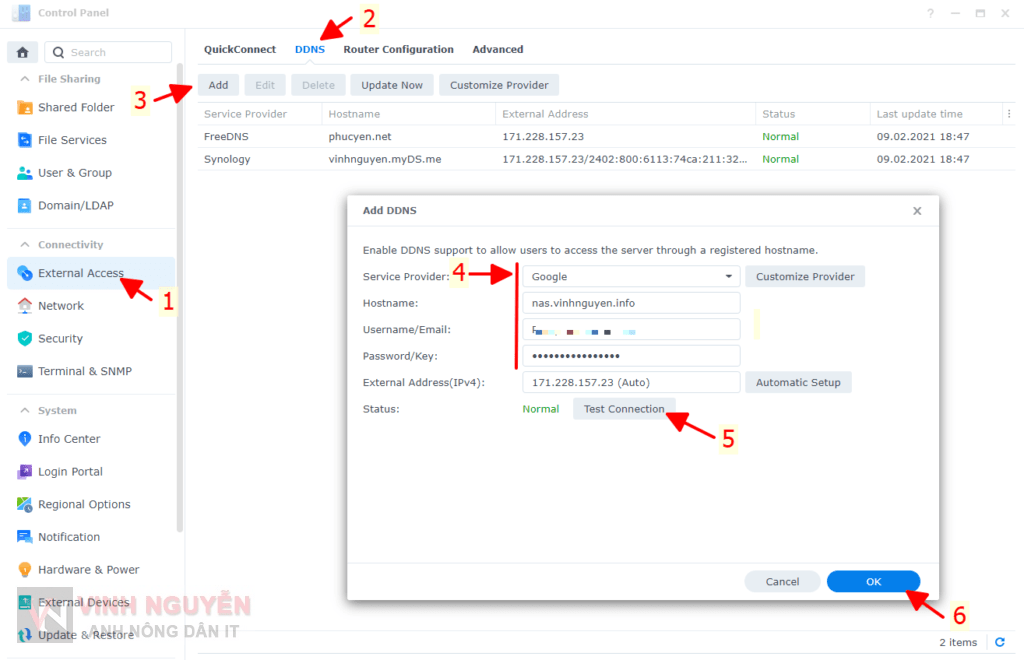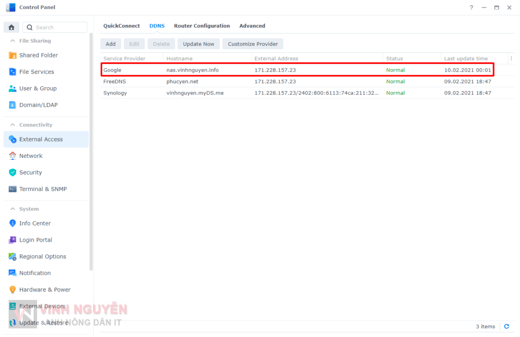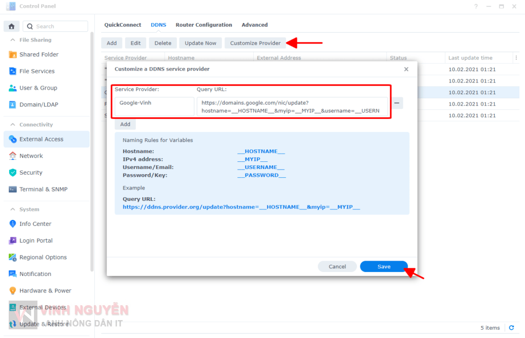 - Vào Control Panel => External Access => DDNS => Add