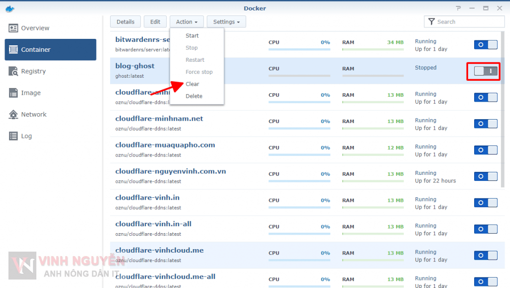 - Bước 2. Sau khi tải xong bạn vào tab Container tiến hành tắt container cần cập nhật. Vào menu Action chọn Clear, đợi hệ thống làm xong tác vụ clear thì bạn tiến hành bật lại. Lúc này container sẽ chạy với bản Image mới nhất bạn vừa tải về. Các thông số cấu hình và dữ liệu của bạn vẫn còn nguyên không bị mất nhé