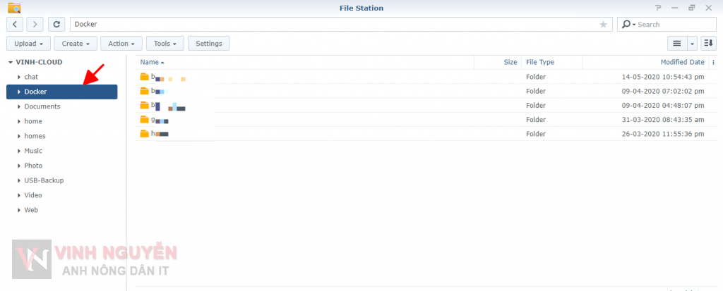 Sau khi cài đặt xong thì hệ thống sẽ tự tạo một thư mục docker để bạn lưu dữ liệu gắn kết của các container. Thực ra thì bạn gắn kết ngoài thư mục docker cũng được, nhưng để dễ quản lý thì bạn lên lưu vào đây. Và mỗi container cần gắn kết thì bạn lên tạo một thư mục con riêng.