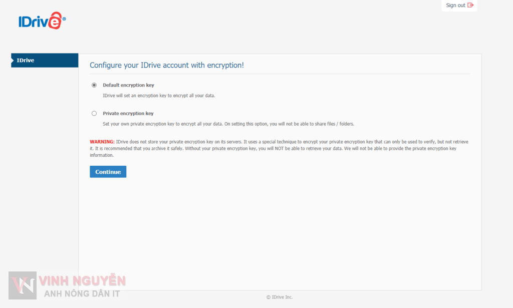 - Lưu ý: IDrive sẽ không lưu khóa cá nhân của bạn vì vậy khi bạn chọn khóa cá nhân thì bạn phải nhớ nếu không sẽ không truy cập được bào dữ liệu của bạn.
