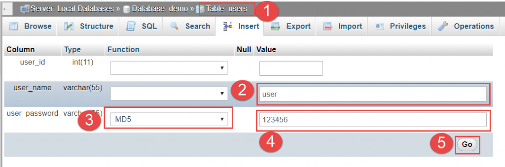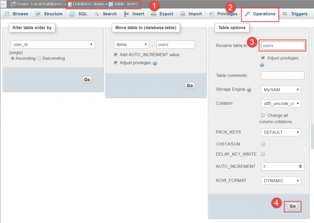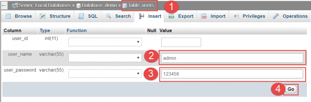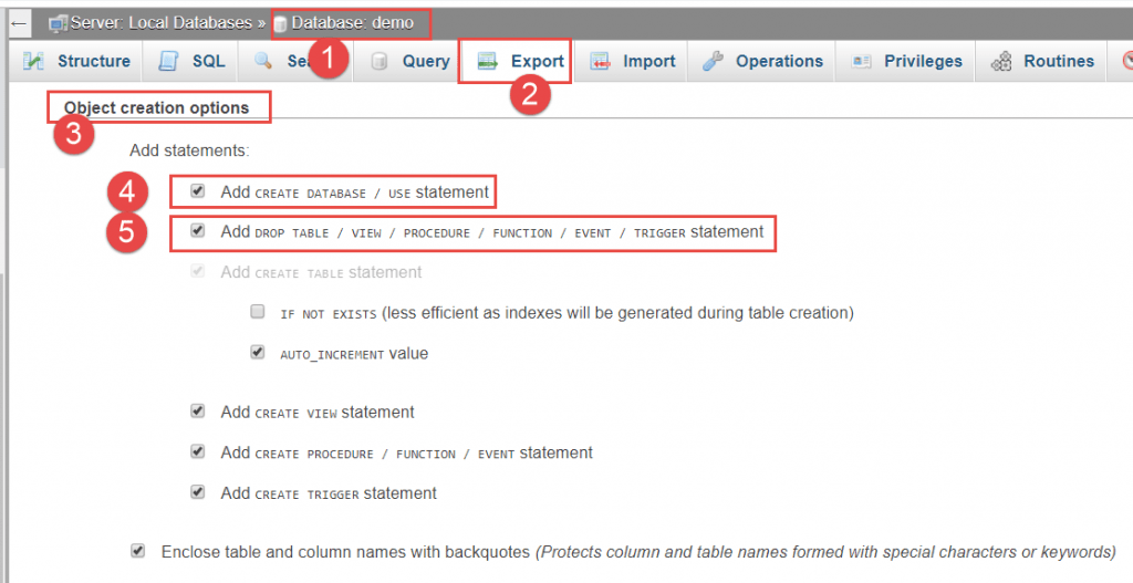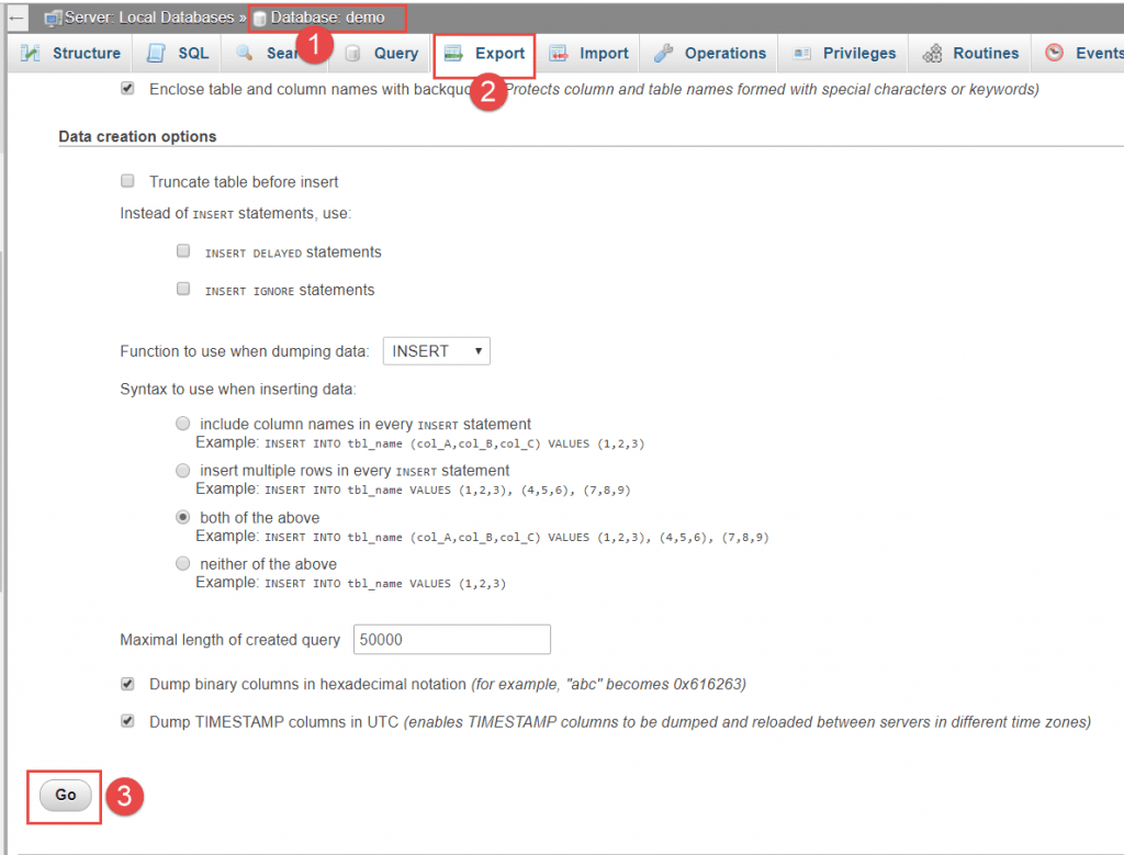 Sau khi đã thiết lập trong các bước trên, nhấn Go tại vị trí (3) để lưu thành file. Gợi ý: cách đặt tên file trùng với tên cơ sở dữ liệu. Ví dụ: demo.sql.