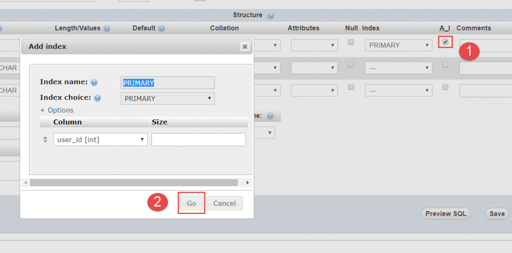 - (1) Tại cột chọn làm khóa chính, chọn mục A_I (Auto Increment). Ý nghĩa: cột này có giá trị tự tăng dần khi thêm dữ liệu vào bảng. Ví dụ: thêm dòng đầu tiên sẽ có giá trị 1, dòng thứ 2 sẽ có giá trị 2, … Chú ý rằng: cột này không được tự ý nhập vào.