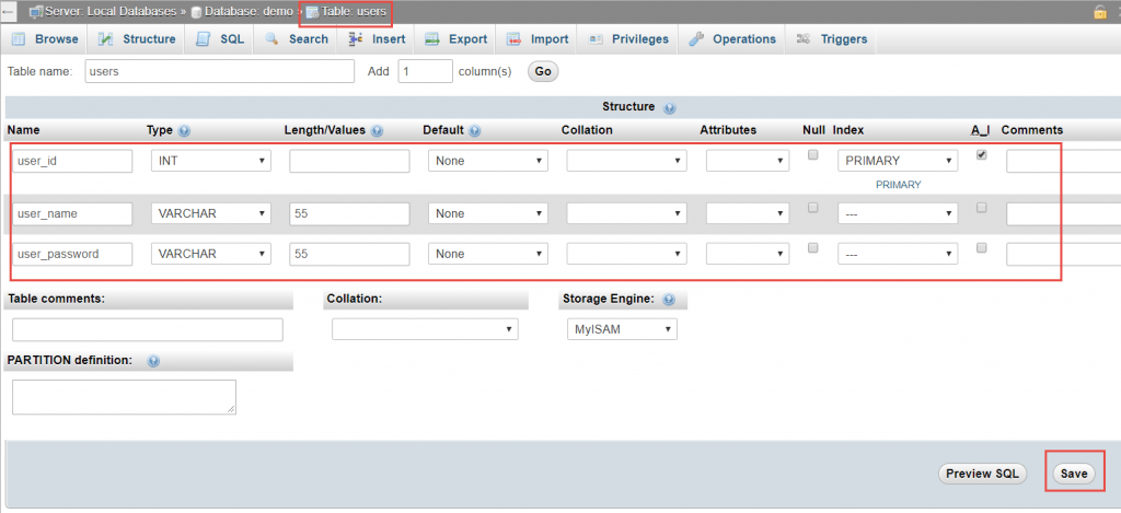 - (2) + (3) + (4) Nhập tên cột, kiểu giá trị (số: INT, chuỗi: VARCHAR) và chiều dài giá trị.