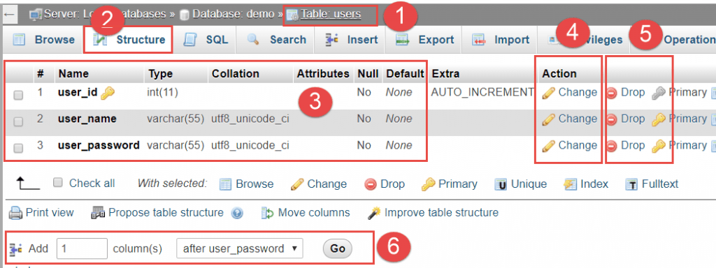 - (1) Chọn bảng cần xem cấu trúc. Chú ý rằng, trước đó phải chọn database chứa bảng cần xem.