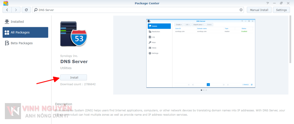 - Cài đặt DNS Server. Vào Package Canter tìm kiếm từ khóa DNS Server rồi cài đặt vào NAS.
