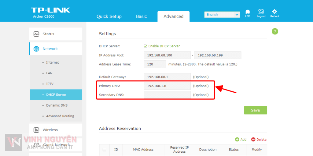 Tiếp theo bạn cần cấu hình DNS bắng địa chỉ IP của NAS trên router hoặc máy tính. Để cho nhanh và áp dụng cho tất cả các thiết bị thì bạn cấu hình luôn trên router. Thường DNS nó sẽ ở trong mục DHCP Server của router.