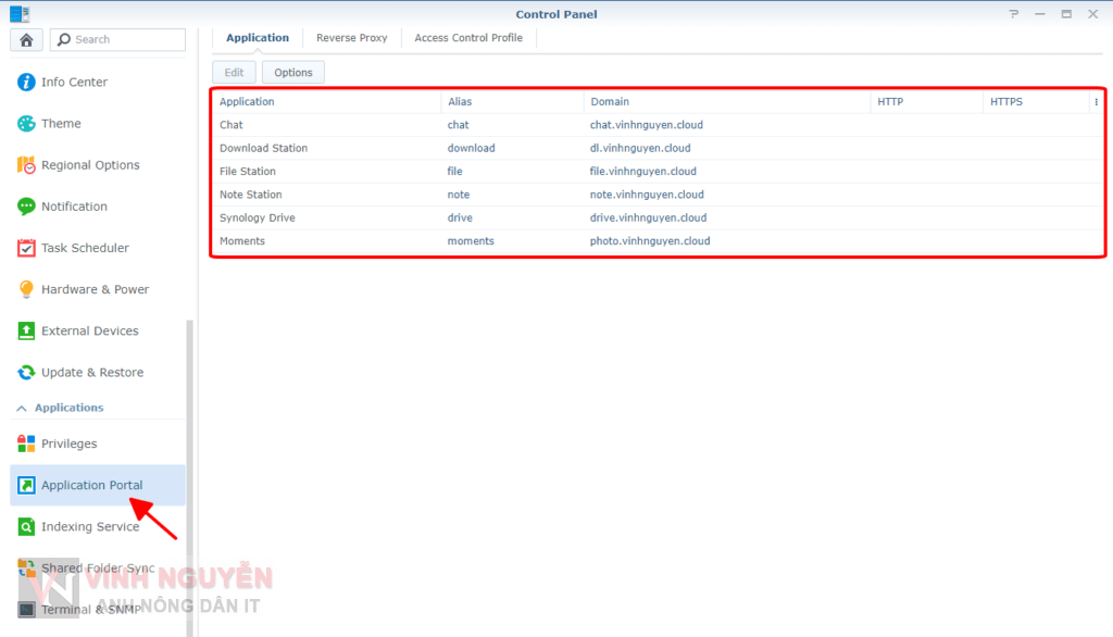Tiếp theo bạn vào ứng dụng muốn tạo tên miền truy cập nhanh, ở đây mình lấy ví dụ là ứng dụng Synology Drive => Edit.