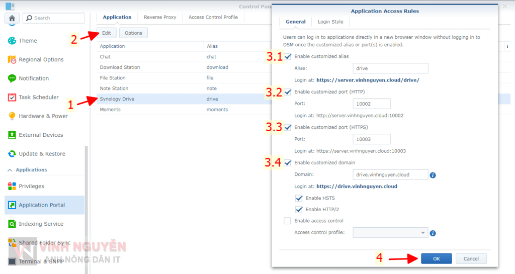 - (3.4) Tick vào nếu bạn muốn truy cập bằng tên miền hoặc tên miền phụ. VD của mình là: drive.vinhcloud.com.