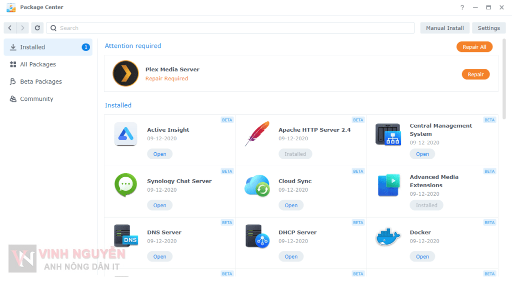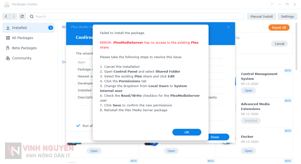 - Đối với những bạn như mình có ứng dụng Plex trước khi up lên DSM 7.0 thì tiến hành Repair.