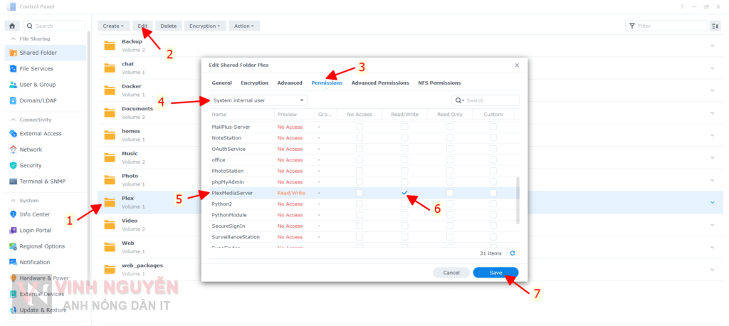 - Bạn tiến hành sửa lỗi phân quyền như sau. Bạn vào Control Panel => Shared Folder tiến hành phân quyền Read/Write cho thư mục Plex và các thư mục chứa nội dung của bạn.