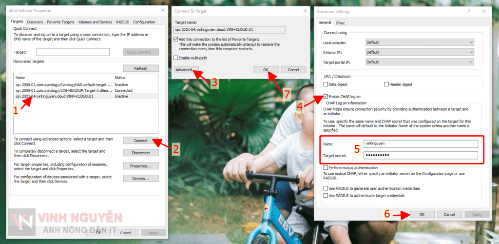 - Trong trường hợp bạn không Enable CHAP thì chọn iSCSI Target bạn cần dùng rồi nhấn Connect là xong bước này.