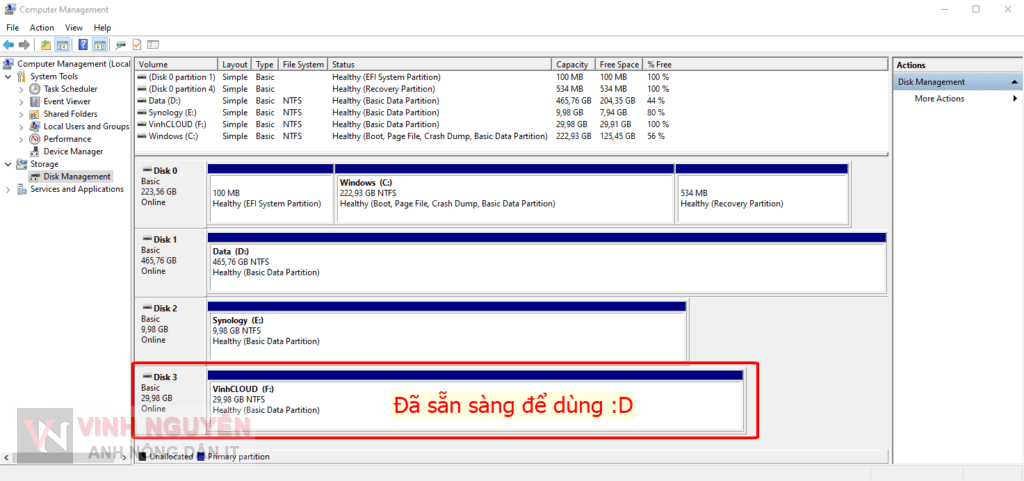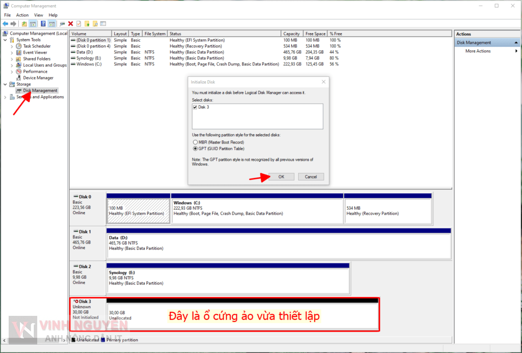 Tới đây thì quá đơn giản rồi… Bạn chỉ việc vào Computer Management => Disk Management sẽ thấy ổ cứng ảo và định dạng để dùng thôi
