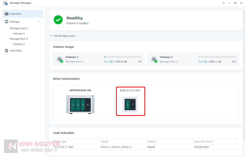 Bạn có thể tạo bộ nhớ cache hoặc nếu muốn tạo bộ nhớ lưu trữ thì xem bài viết Synology NAS – Tạo phân vùng lưu trữ từ SSD NVME cache.